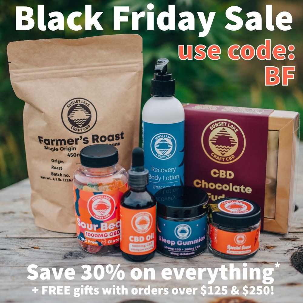 Sunset Lake CBD’s Black Friday Sale is live! Head on over to sunsetlakecbd.com and use code BF to save 30% sitewide! That’s not all — orders over $125 will get to choose a FREE 20-count jar of their choice of gummies during checkout. Orders over $250 will also get a sweet Sunset Lake Beanie.