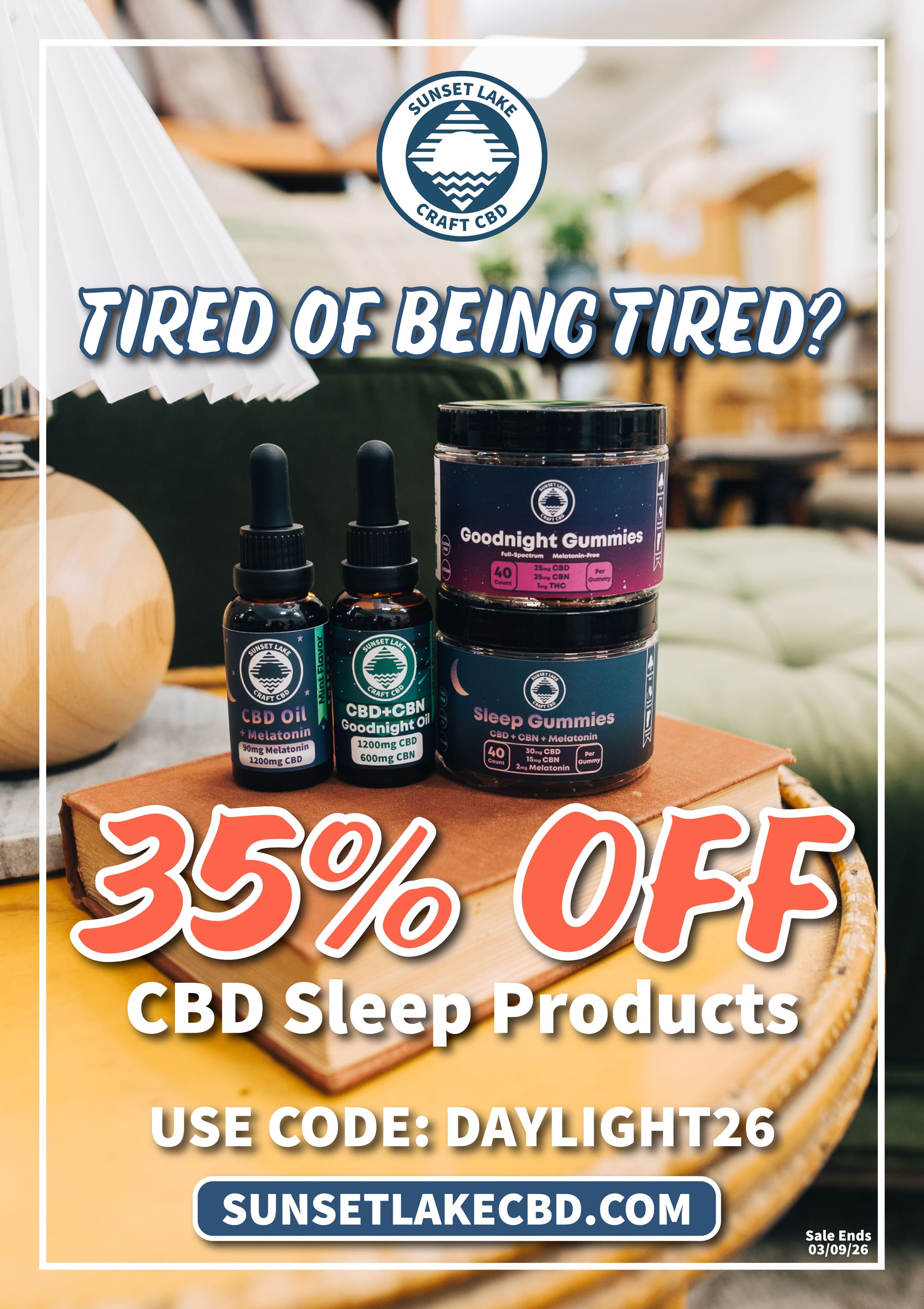 Studies have shown that losing an hour of sleep because of Daylight Saving Time can throw off your sleep schedule, negatively impact your ability to focus, and spike your stress levels. CBD can help your body adjust naturally, promoting relaxation and deeper sleep without grogginess the following day. Right now, you can save 35% on Sunset Lake CBD’s best sleep-supporting gummies, tinctures, and more when you check out with code Daylight26.