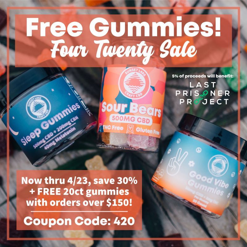 www.sunsetlakecbd.com and use coupon code “420” for 30% off everything. Orders over $150 will be able to add a 20-count of gummies to their order for FREE!